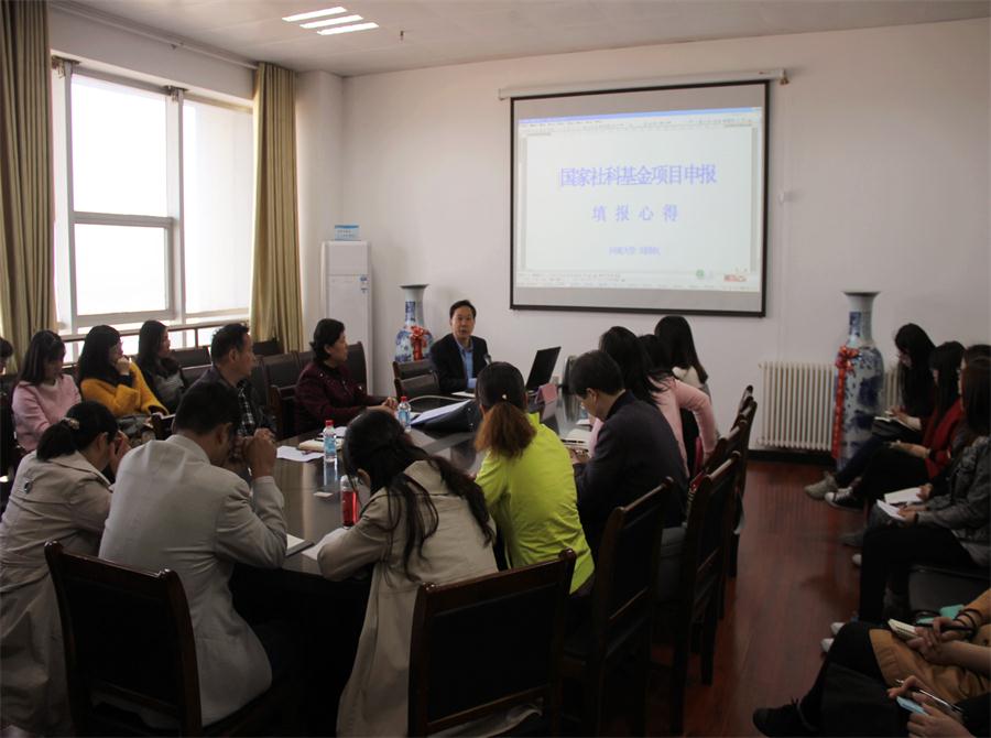 刘泽权教授首先向大家介绍了近三年国家社科基金语言学及外国文学类项目的申报动态和立项热点,并结合他本人2015年度申报并获批立项的国家社科基金重点项目“基于语料库的两岸三地百年女性文学翻译史论”的申报经验,向大家系统传授了项目选题技巧、申报书填写的方法与注意事项等。最后,刘教授还与参加讲座的教师进行了互动交流,解答了大家提出的问题。刘泽权教授丰富的科研经验、渊博的学识给在座的教师留下了深刻的印象,鼓舞了大家申报高层次项目的积极性。