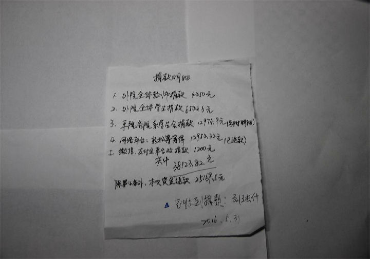 刘佳佳同学生病及住院期间,我院在师生中倡议为刘佳佳同学积极捐款,我院师生共捐款1.1万元左右。校团委、学生处也通过各院学生会动员全校各院学生为刘佳佳同学捐款共计1.29万左右。刘佳佳所在班级学生通过网络平台为其筹集捐款共计1.5万左右,我校师生和社会各界人士共为刘佳佳同学捐款38123.8元。社会各界人士和学校同学充分发挥了“一方有难,八方支援”的无私奉献精神和爱心,为刘佳同学提供了很大的帮助,使其能够继续接受治疗。刘佳佳家人在接到学校捐款时参老师和同学们的无私帮助表示衷心的感谢,并亲自把感谢信递交给了田建伟书记,并表示一定牢记太阳tyc151cc师生的情义和大家提供的帮助。