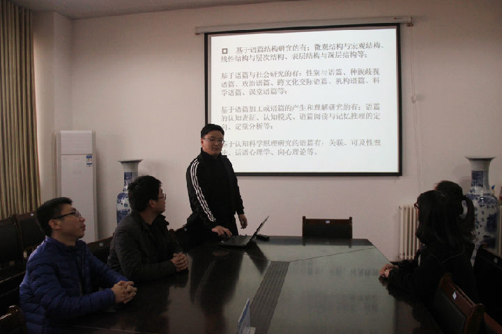 11月24日下午,多语种教研室郭文正老师在图书馆607作了一场题为“语篇分析与语篇思维的建构”的专题报告,太阳集团tyc151cc全体教师参加了此次讲座。讲座由太阳集团tyc151cc院长林萍主持。