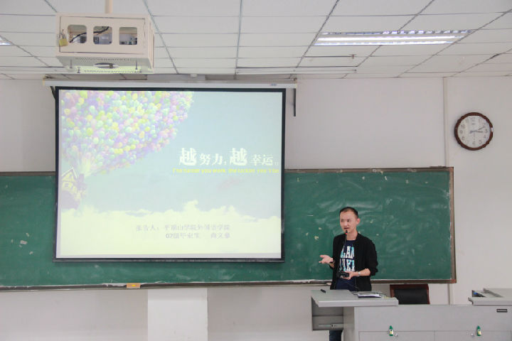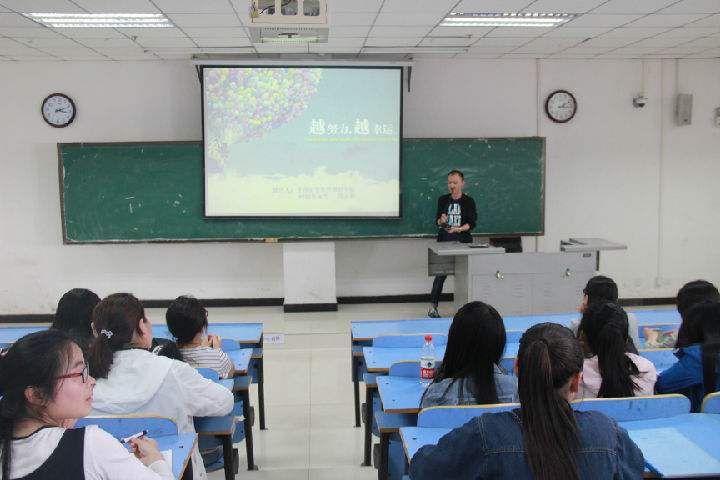 尚文豪从他的大学生活和两段工作经历为同学们讲述他的亲身经历和切身体会。竞选文艺部部长、学习各种舞蹈、下乡支教等丰富的大学生活引起了在坐学生的强烈共鸣,使同学们更加珍惜当下的大学时光。讲到自己的两份工作,尚文豪称,那是自己的成长经历。从刚开始的“管班?不会;教学?不会!”到内心有所领悟,再到“桃李满天下”的蜕变,尚文豪坚持随遇而安的人生信条,快速成长。最后,他告诫同学们,无论干什么,都要有幸福感,学会创造快乐,永远相信有好运在你前面。讲座内容丰富、案例生动,激发了我院学生专业学习兴趣。
