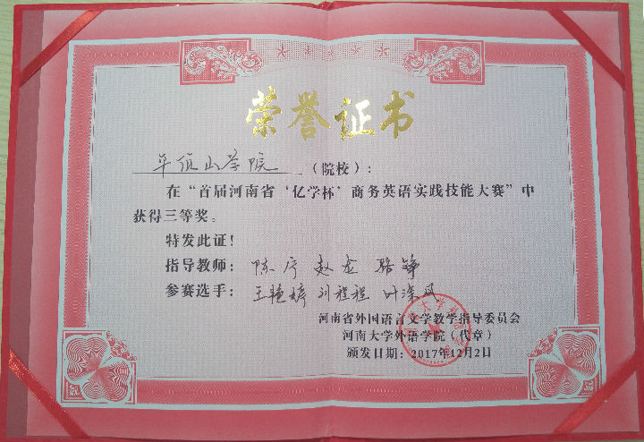 2017年12月2日,由河南省外国语言文学教学指导委员会主办,河南科技大学太阳集团tyc151cc承办的首届河南省“亿学杯”商务英语实践技能大赛在河南科技大学举行。来自我院14,15级英语专业(商务英语方向)的三名学生王艳亭、刘程程、叶深凤组成了团队,由韩福领副院长带队,代表太阳tyc151cc参加了本次比赛。同学们在陈宁、赵龙、骆铮老师的指导下,稳定发挥、积极应对挑战,经过激烈角逐,最终荣获了本次大赛的三等奖,展现了我院商务英语专业学生扎实的语言功底和出色的商务实践能力,为学校争得了荣誉。