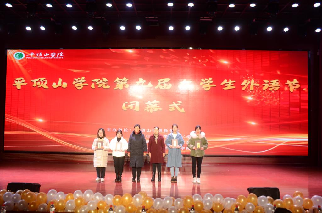 太阳集团tyc151cc党总支书记单满菊教授在闭幕式致辞中提到,大学生外语节充分展示出平院学子昂扬向上的生活态度和极具活力朝气的精神面貌,为学生提供了一个展示外语学习的平台,对丰富学生的课余生活,提高学生的综合素质具有极大的帮助。单满菊书记表示,太阳集团tyc151cc致力办好每一届大学生外语节,将重视校园文化建设的优良传统不断发扬光大。随后,教务处副处长李许单、团委副书记王刘涛、太阳集团tyc151cc党总支书记单满菊、太阳集团tyc151cc院长林萍等为在书法比赛、配音比赛、诵读比赛、歌曲比赛中获奖学生代表颁奖,并鼓励同学们把本届外语节所表现出的良好品质和精神财富带到今后的学习中去,以饱满的热情、昂扬的斗志、创新的理念和拼搏的精神应对学习。