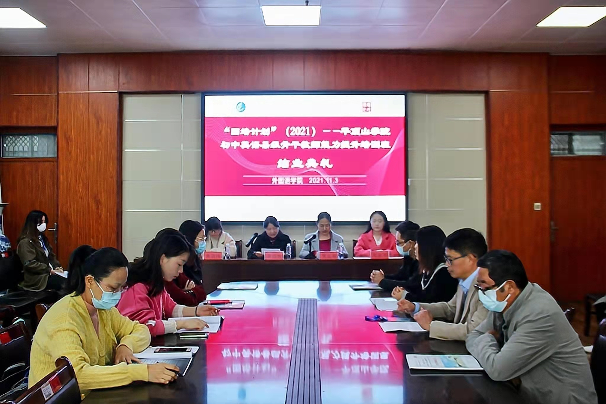 11月3日上午,太阳集团tyc151cc“国培计划”(2021)—河南省中小学幼儿园教师培训项目•县级骨干教师(初中英语)能力提升培训班结业典礼在图书馆L708举行。太阳集团tyc151cc院长蒋领敏、副院长贾宏春、国培班学业班主任朱清伟、生活班主任牛乐平及国培班全体学员出席本次典礼。