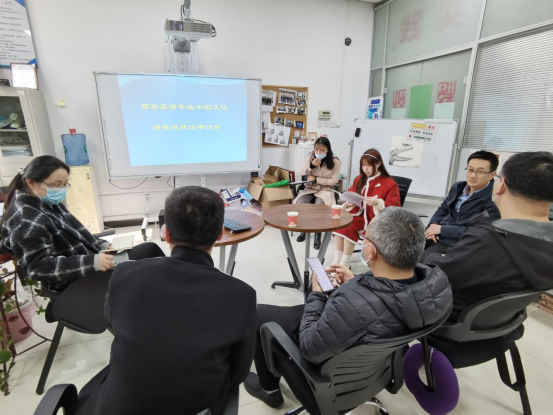 通过研讨,我专业老师对于课程链下课程知识体系的构建有了深入的理解,并对各个课程中的中国文化教学内容进行了有效整合。赵龙老师在最后总结时提出,中国文化教学是专业教学的共同内容,通过构建中国文化课程链教学体系,能够深化教学内容,提升课堂效果,培养深度理解、高度认同中国文化的商务英语人才。