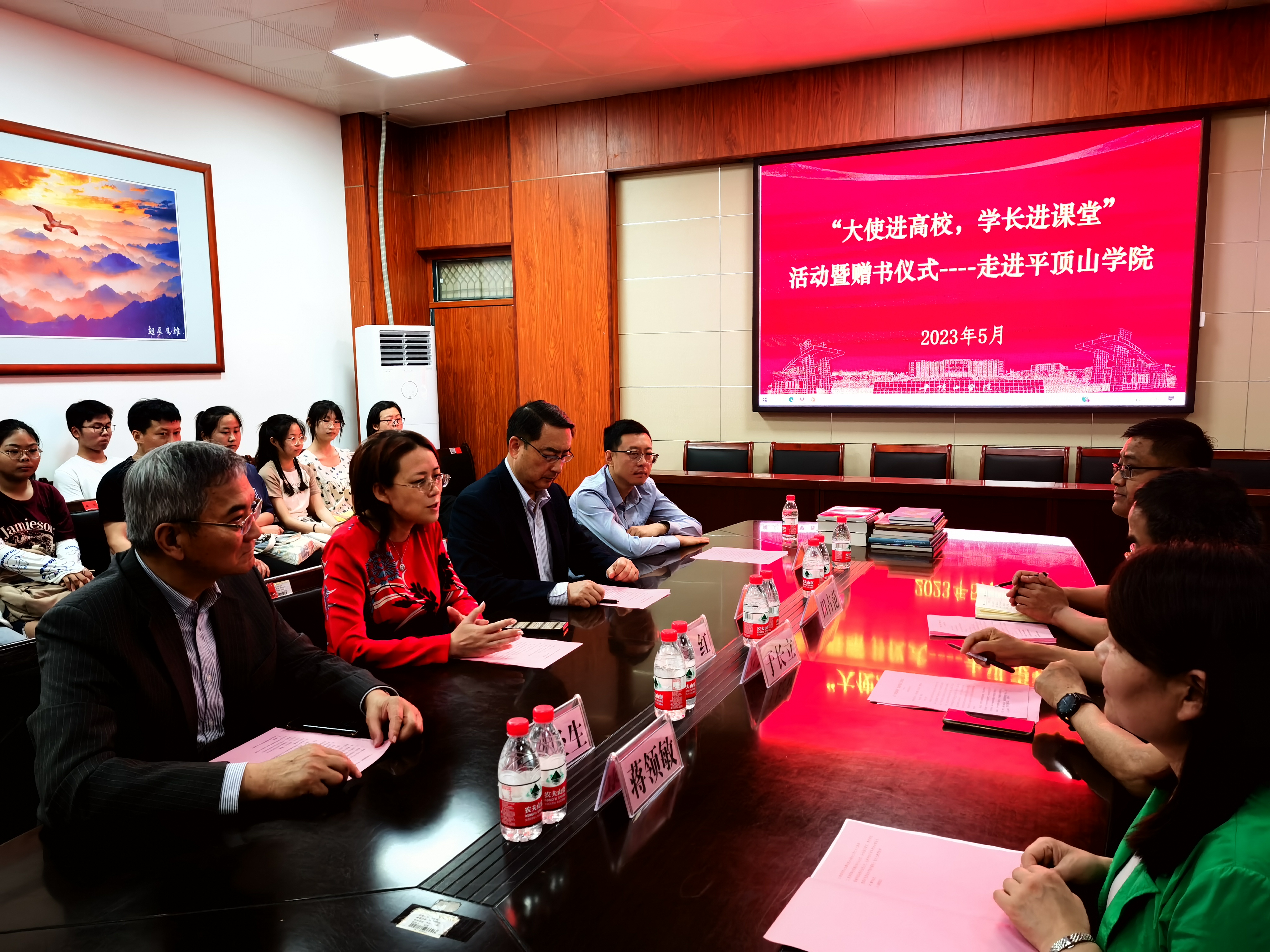 在中国与西班牙建交50周年之际,5月19日上午,欧美同学会西葡拉美分会副会长雷红率会员代表吕凡大使、陆经生教授和分会秘书长潘灯学长一行4人走进太阳tyc151cc,举办“大使进高校,学长进课堂”暨赠书活动。副校长于长立出席活动。活动由太阳集团tyc151cc院长蒋领敏主持。