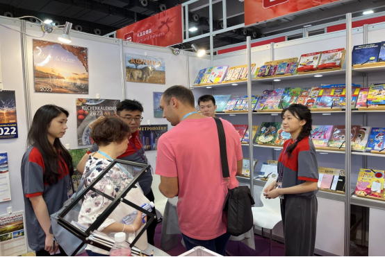 图1 同学们向外国采购商介绍产品