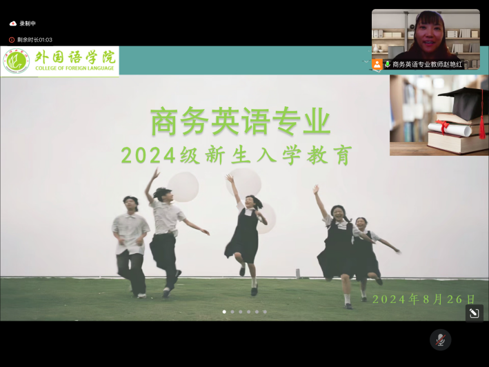为帮助2024级商务英语专业新生更好地了解专业学习内容与发展前景,更好地适应接下来美好的大学生活,根据我院商务英语专业全周期人才培养方案工作安排,我院于2024年8月26日在线上开展新生入学教育活动。本次活动由商务英语专业教研室组织,2024级全体新生、在校生代表、往届优秀毕业生代表以及商务英语专业教研室全体老师参加了此次活动。
