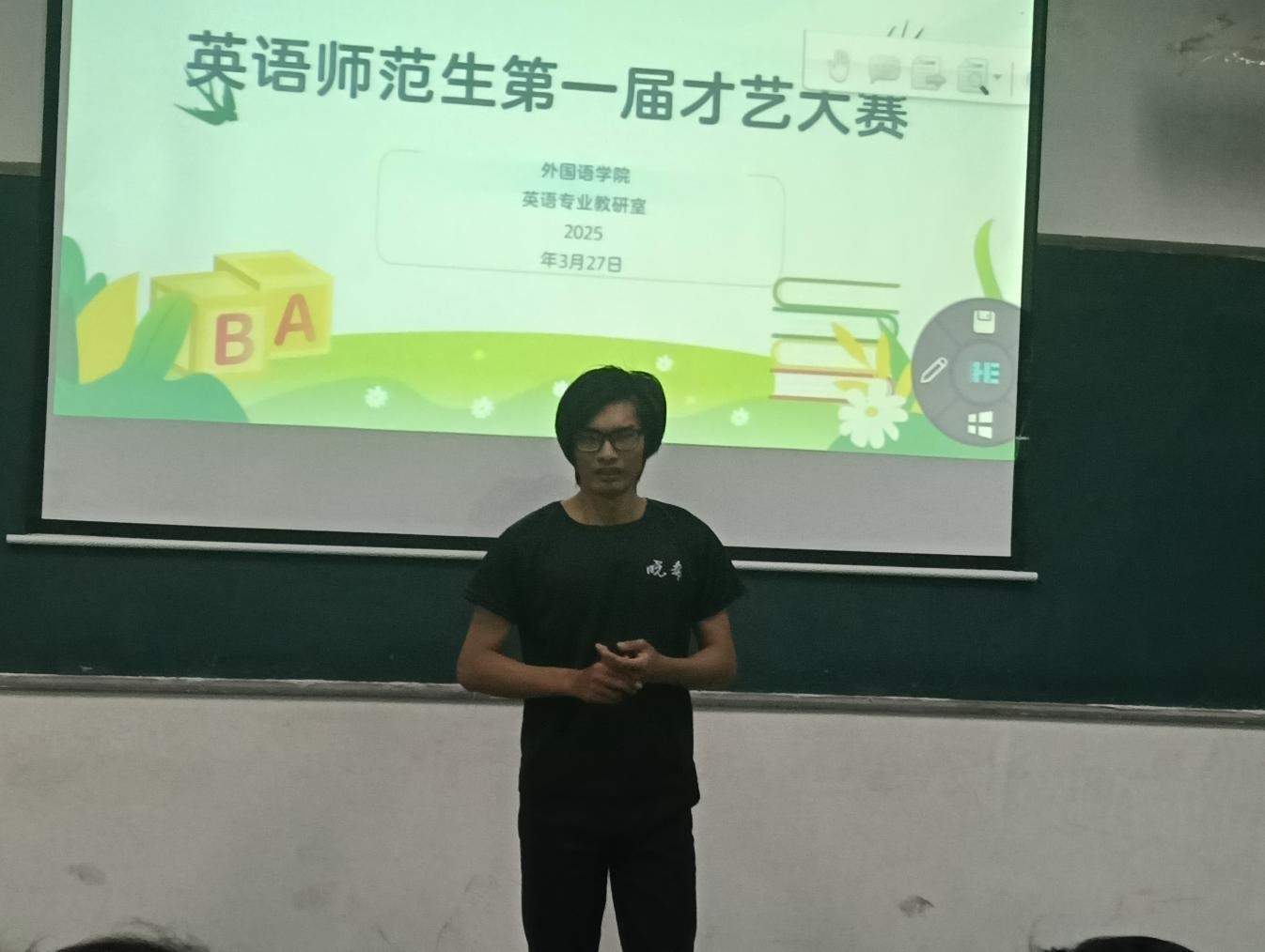 为全面提升英语师范生的综合素质,培养创新与实践能力,丰富校园文化生活,同时为教育事业储备优秀人才,2025年3月27日下午,太阳集团tyc151cc在1106教室成功举办了英语师范生第一届才艺大赛。本次大赛由太阳集团tyc151cc英语专业教研室精心策划主办,学院多位教师担任评委。
