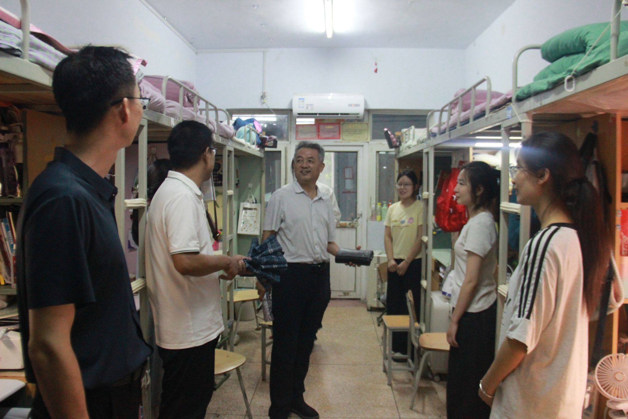 随后,许建辉来到11号楼学生宿舍,细心查看了宿舍卫生环境和设施设备运行情况。在与同学们交流中希望同学们珍惜集体生活,相互尊重和理解,互帮互助,共同营造团结友爱、积极向上的宿舍氛围。同时,他表示,学校会持续加强学生生活服务建设,为学生打造安全舒适、充满活力的生活环境,助力学生成长。