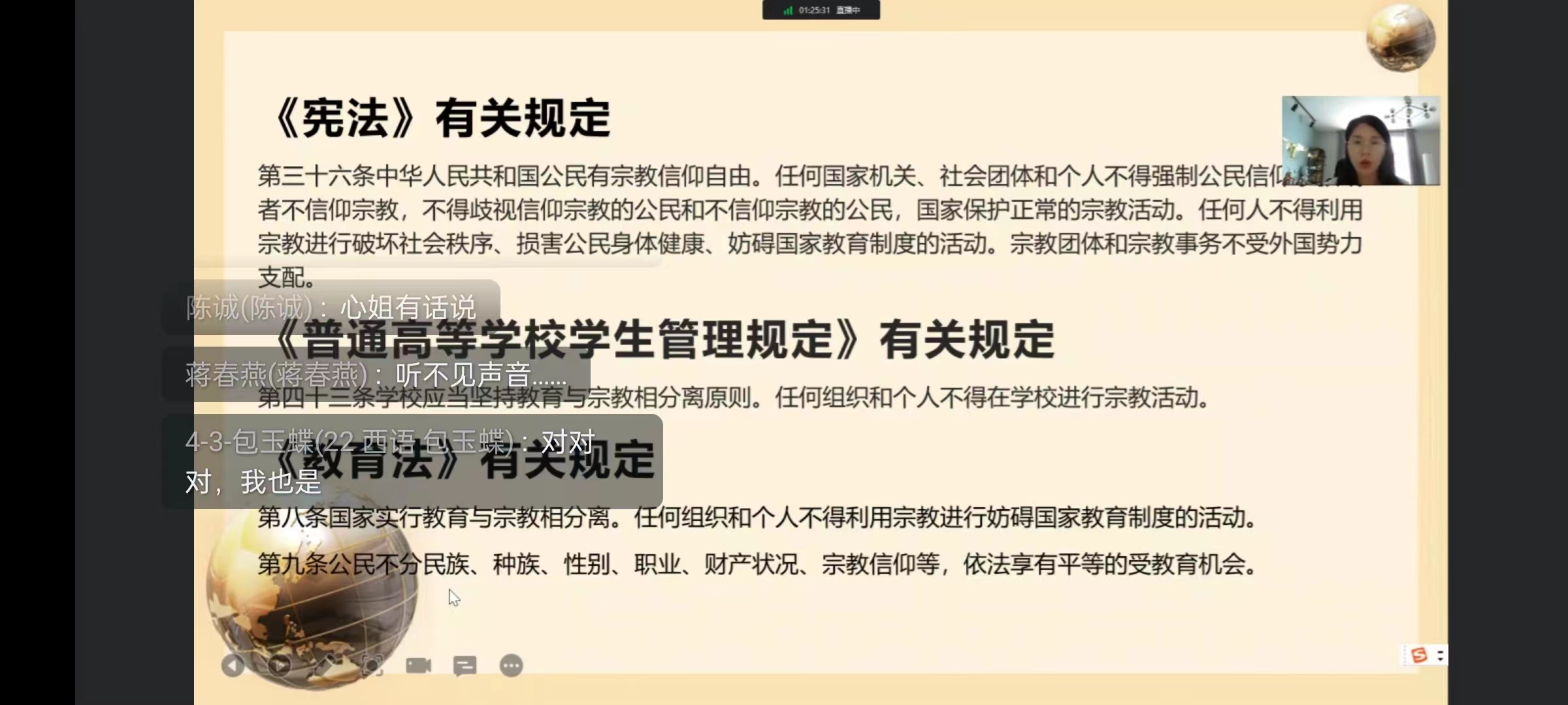 大会伊始,韦士心从邪教的危害、处理邪教的政策、法规以及如何抵制邪教诱惑等几个方面进行详细讲解,并通过大量案例让同学们意识到邪教的本质,明白邪教组织和宗教的区别所在。接着,韦士心向同学们普及了在日常生活中辨别邪教的方法,讲解了邪教组织是如何进行非法活动的,并教育同学们要认清邪教的本质,增强抵御邪教的能力。随后,韦士心又带领同学们学习了《宪法》、《普通高等学校学生管理规定》及《教育法》中对宗教的相关规定,她强调,在大学校园中,要认真贯彻执行党的宗教方针和政策,严禁在学校举办宗教活动,严禁在教学活动中传播宗教,要做到教学活动与宗教相分离。最后,韦士心讲到,现代化道路上的大学生要以务实的精神追求真理,把握事物的客观规律,树立正确价值观,坚决抵制非法宗教活动和邪教活动,并教育引导同学们防范时要做到四个“不”:不听、不看、不信、不传。