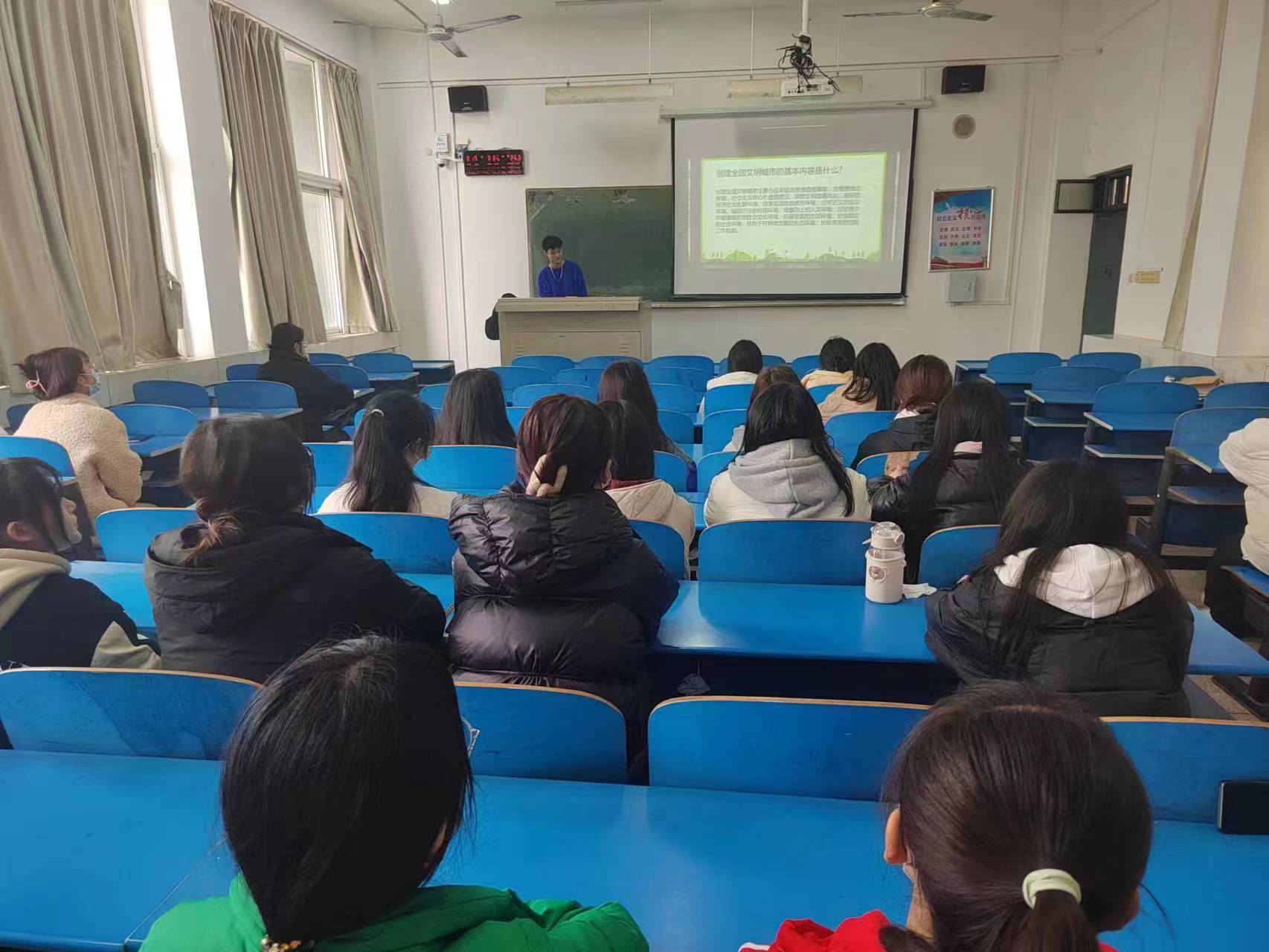 活动伊始,各支部团支书带领同学们齐唱中国共产主义青年团团歌,并带领同学们共同学习《创建全国文明城市应知应会知识8问》,加深了同学们对创建文明城市概念的认识。接着,各支部团支书为同学们播放了创建文明城市宣传片。通过观看宣传片,同学们深入了解了全国文明城市创建工作,体会到了文明城市创建的重要性,也坚定了投身创建文明城市伟大事业的决心。最后,各支部团支书呼吁同学们要践行“共创文明城市,共建文明校园,争做文明师生”倡议,希望大家在生活中落实文明行动,共创美丽鹰城。同学们纷纷表示在今后的学习生活中会爱护身边环境,积极投身于文明城市创建活动中去,努力营造健康,舒心的校园环境。