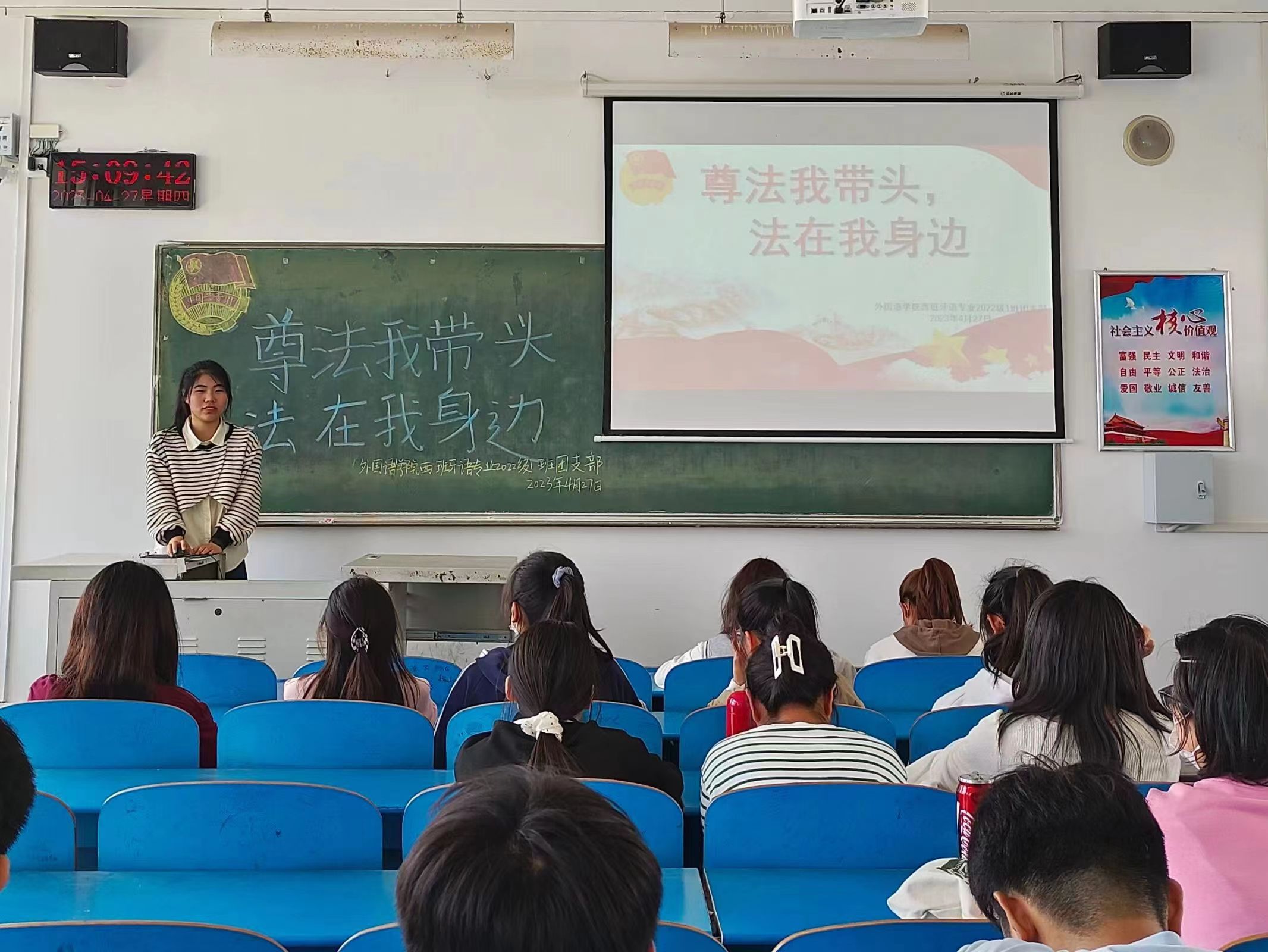 为推动法治宣传教育走深走实,进一步提升同学们的法治素养,4月27日下午,太阳集团tyc151cc团委各支部通过线上线下相结合的方式开展了以“尊法我带头,法在我身边”为主题的团日活动。本次团日活动由各班团支书主持,太阳集团tyc151cc全体同学参加。