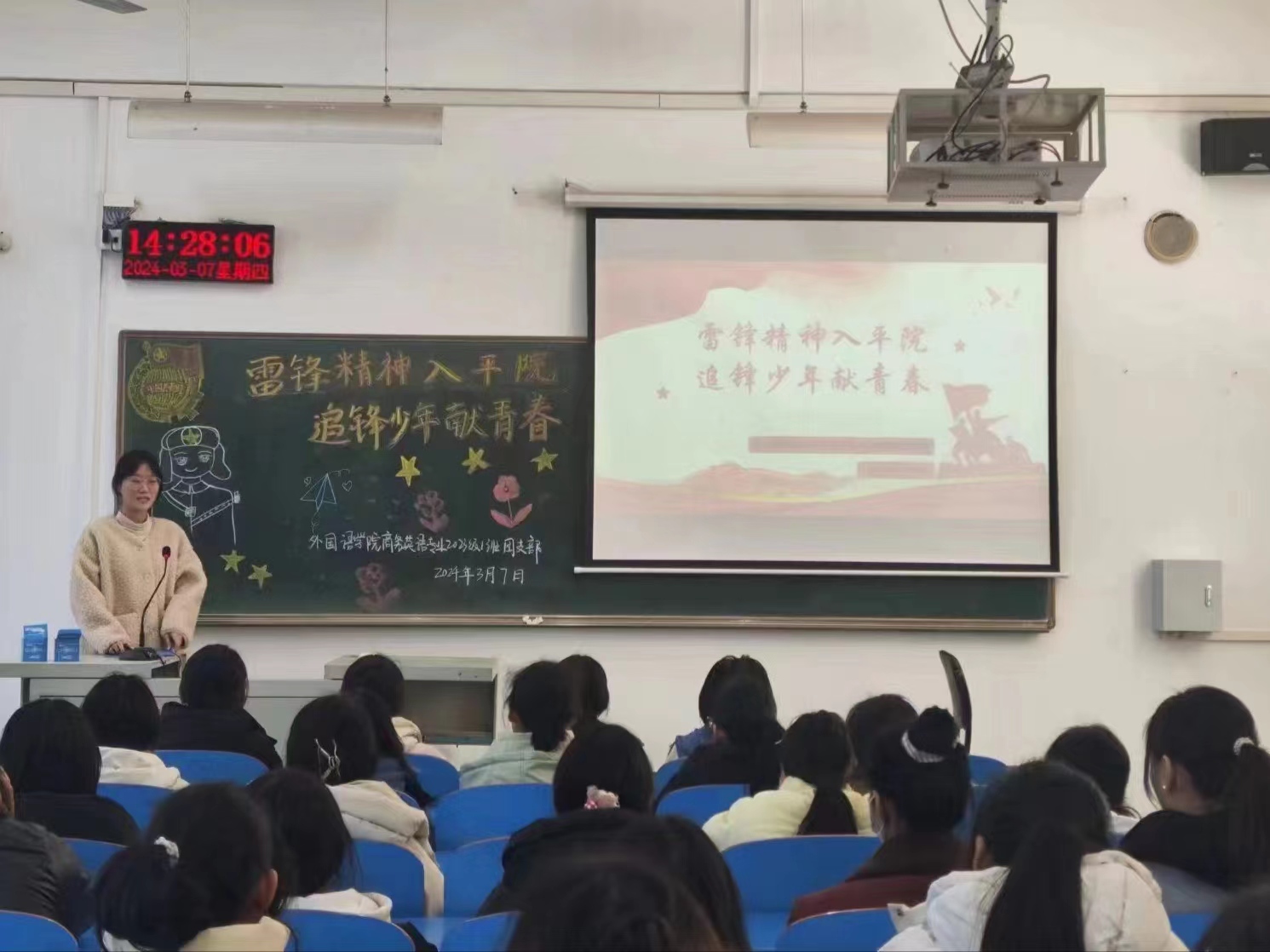 活动伊始,各支部团支书带领同学们齐唱中国共产主义青年团团歌,并与同学们共同学习了共青团中央平台发布的《高扬起新时代雷锋精神的旗帜》等篇目,帮助同学们深刻理解雷锋精神的内涵。接着,各支部团支书向同学们介绍了雷锋同志的生平并组织观看了《学习雷锋》视频,激励同学们以雷锋精神为指导,积极参加各类社会实践活动,从实践中体会雷锋精神的实质。最后,各支部团支书就新时代如何弘扬雷锋精神与同学们进行了深入讨论,同学们积极发言,纷纷表示在未来的学习和生活中一定会以雷锋精神为指引,充分学习榜样精神,发奋图强,用自己的实际行动服务群众,奉献社会。