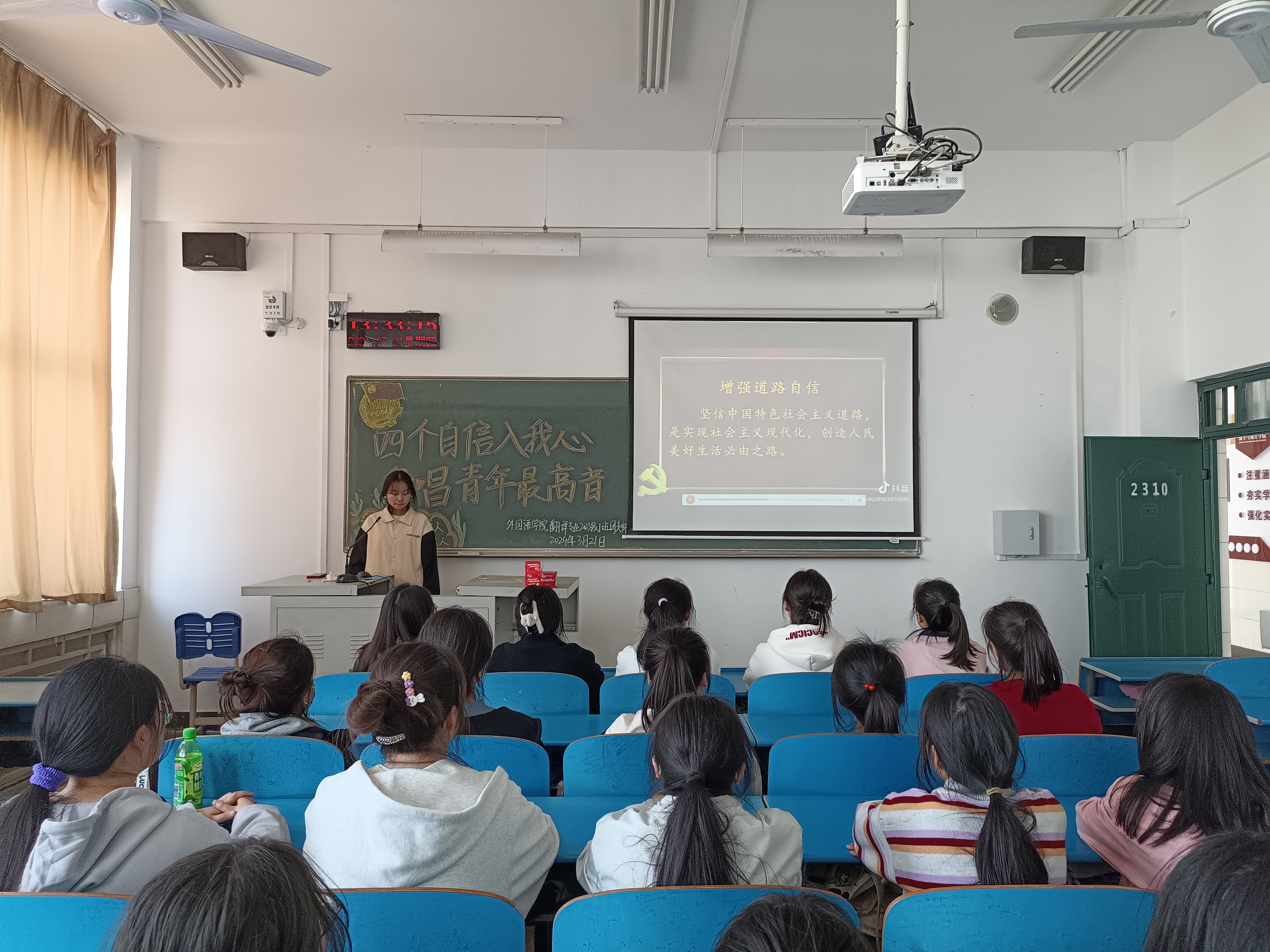 活动伊始,各支部团支书带领同学们齐唱中国共产主义青年团团歌,并与同学们共同学习了共青团中央学习平台中的《习近平论“四个自信”》、《以全过程人民民主为中国式现代化凝心聚力》等思想政治类篇目,帮助同学们增强了对全过程人民民主生动实践的理解与感悟。接着,各支部团支书组织同学们观看了《习近平总书记关于“四个自信”重要论述研究》、《解码全过程人民民主》等视频,并向同学们强调了“四个自信”的本质要求以及时代价值,各支部团支书讲到,同学们要敢于实践,在实践中升华理论知识,夯实理论功底。最后,各支部团支书鼓励同学们就“如何坚定‘四个自信’”发表自己的理解与感悟,同学们积极发言并纷纷表示,今后自己将积极参与社会实践与文化交流活动,提高自身综合素质。