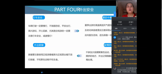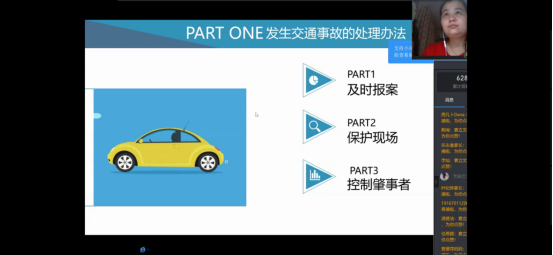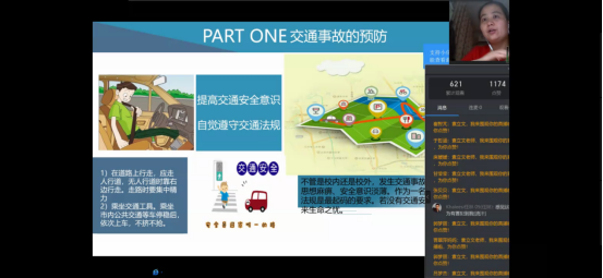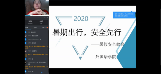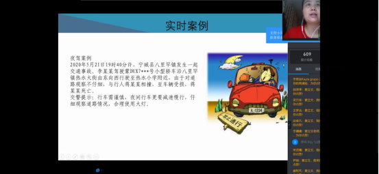 首先,袁立文老师对于同学们日常出行和暑期计划进行了线上调研,同学们积极回应。然后她围绕着出行安全带领学生学习交通安全、驾驶安全、旅游安全、外出安全等教育内容,并且针对不同安全类型提出了相应的预防与解决办法,其中袁立文老师提到对于交通事故的预防中,同学们应该提高交通安全意识,自觉遵守交通法规。在发生交通事故时,同学们要及时报案,保护现场并且控制好肇事者。同时,袁立文老师还就同学们机动车和非机动车的驾驶安全注意事项详细讲解,嘱咐同学们一定要系好安全带,骑行戴头盔,遵守交通法规。紧接着袁立文老师通过北京新发地疫情情况和浙江温岭槽罐车爆炸事故讲述了出行的安全隐患和常识,让同学们认识到在日常生活中防患于未然的重要性和生命的脆弱与可贵,进一步的提高了同学们的安全防控意识,并对同学们如何做好外出安全和疫情防控进行了安排。最后,袁立文老师对安全知识进行了总结并建议同学们时刻绷紧安全这根弦,做好疫情防控下的安全出行。