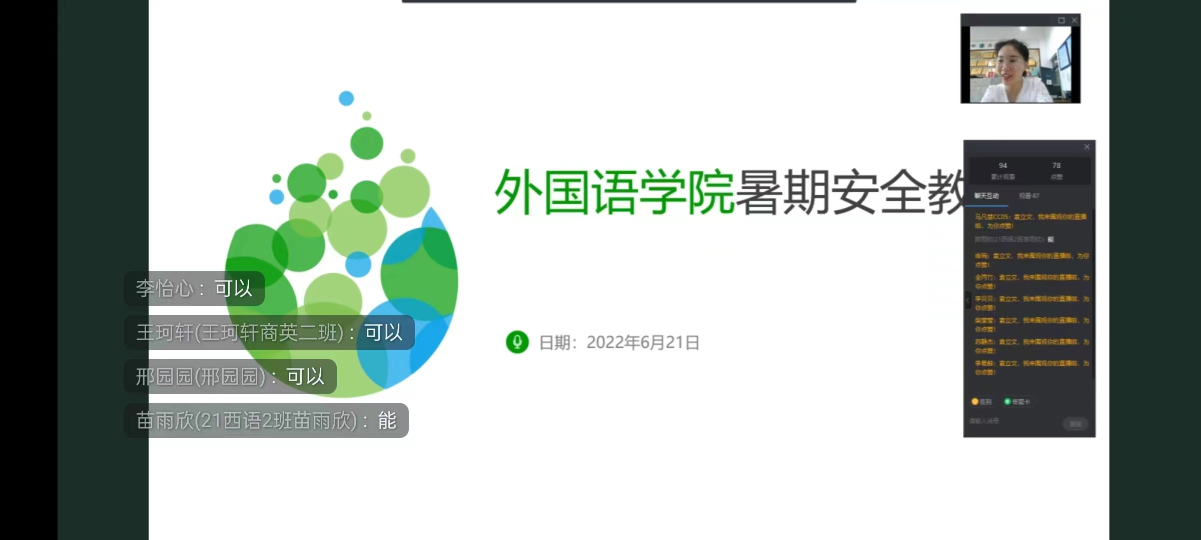 会议中,韦士心从疫情防控、防溺水、交通安全、网络安全以及食品安全五个方面,通过引用现实事例对假期安全进行了深入的讲解。接着,她提醒同学们要提高自我安全意识和责任意识,在假期中自觉遵从当地疫情防控政策,配合疫情防控工作。随后,她针对当前天气极度炎热的情况,告诫同学们外出游玩时不要去不明水域游泳,珍爱生命,谨防溺水。同时,她提醒同学们要高度重视网络安全教育,做到自觉遵守有关法规,文明上网,不传播不实信息、发表不当言论。最后,韦士心建议,同学们合理运用假期时间,在保持学习不放松的同时、在保持安全健康的情况下自觉参加社会实践活动,积极奉献家乡、提升自我。