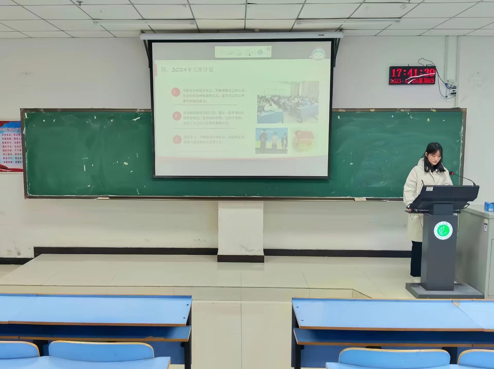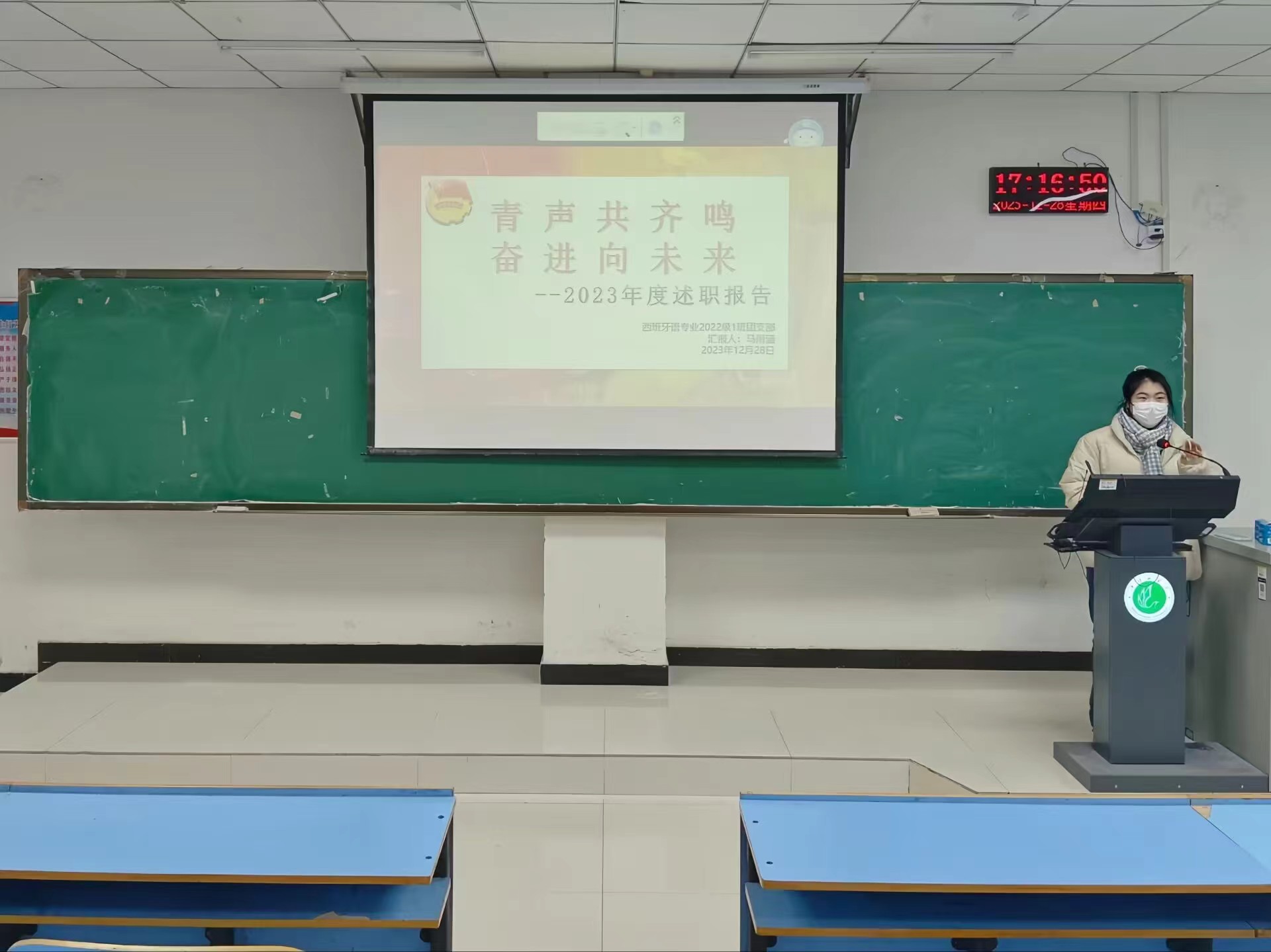 大会伊始,张嫚倪带领各团支部书记齐唱了中国共产主义青年团团歌,并重温了入团誓词。接着,各团支部书记依次通过PPT汇报展示的方式,全面、客观地从个人履职情况、本年度团支部工作开展情况等方面进行了详细汇报,并积极从过去的工作中总结经验和不足,提出相应的改进措施,为下学期团支部的工作发展做好规划。随后,评议组成员就各团支部书记的述职表现进行了点评,各团支部书记表示,会认真听取意见,积极改进工作,努力为团组织的发展做出更大的贡献。最后,石岩对各团支部务实的工作作风和精彩的支部活动表示了充分肯定,并鼓励各团支部要相互学习、取长补短,切实做好团员的思想政治工作,为团组织的发展壮大贡献力量。