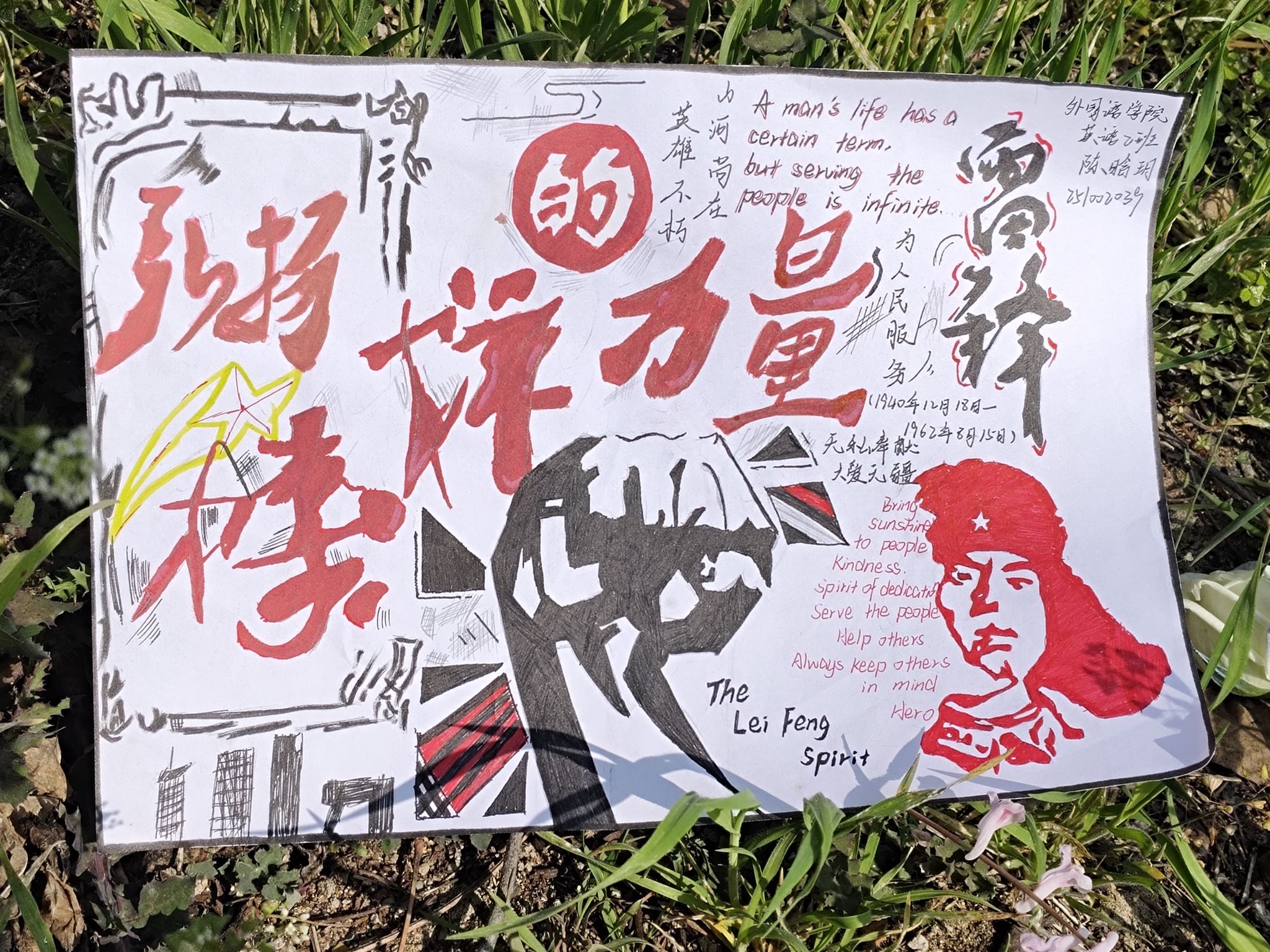 在活动开展期间,同学们以多种形式诠释雷锋精神。在外语主题朗诵比赛中,选手们围绕雷锋事迹、精神内涵及新时代践行路径等议题,选用演讲稿、散文或短文作为素材,以流畅的外语进行朗诵,作品均配中英/中西双语字幕,在清晰表达中传递雷锋精神的温暖力量,展现了扎实的语言功底与跨文化表达能力。在“雷锋瞬间”摄影活动中,同学们用镜头捕捉校园与社会中的志愿善行瞬间,记录助人为乐、无私奉献的动人场景,每幅作品都附上双语说明,讲述画面背后的雷锋故事,让雷锋精神在视觉与文字的交融中焕发生机。在双语主题手抄报活动中,同学们以雷锋事迹、雷锋精神内涵为核心,采用双语形式创作原创手绘手抄报,传递积极正向的价值导向,切实以多元创作传递雷锋精神。