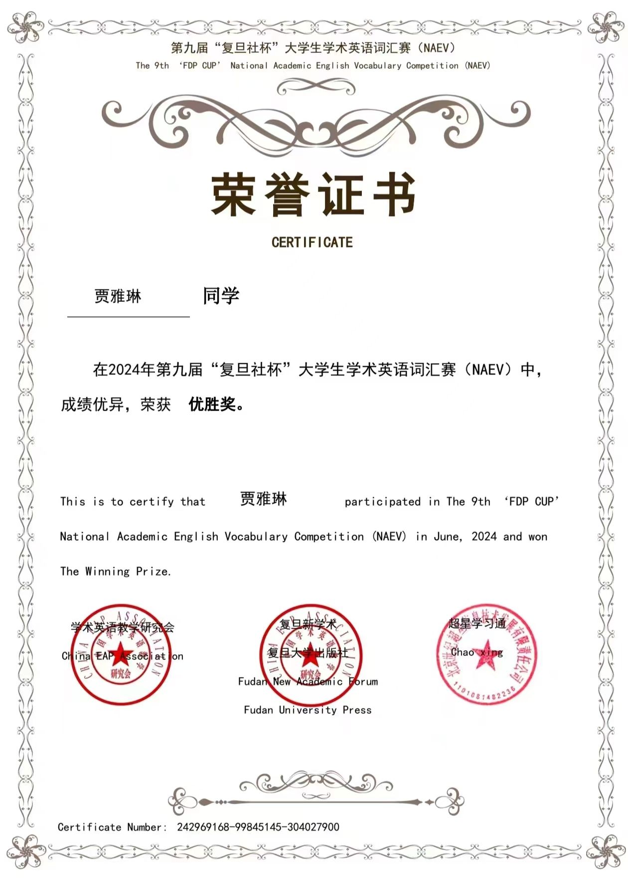 在专业课程学习上,贾雅琳踏实刻苦,学习成绩优异。她不仅注重课堂知识的掌握,还积极参与各类学科竞赛和非专业竞赛,曾获得第九届“复旦社杯”大学生学术英语词汇赛优胜奖、太阳集团tyc151cc语音大赛优秀奖、太阳集团tyc151cc单词打卡大赛三等奖、2024年招生宣传微视频大赛二等奖、太阳tyc151cc第八届心理情景剧大赛二等奖、太阳tyc151cc第十九届“大学语文杯”创新作文大赛三等奖、太阳集团tyc151cc职业规划大赛三等奖等奖项。这些经历不仅提升了她的专业技能,也让她在实践中积累了宝贵的经验,为未来发展奠定了坚实的基础。
