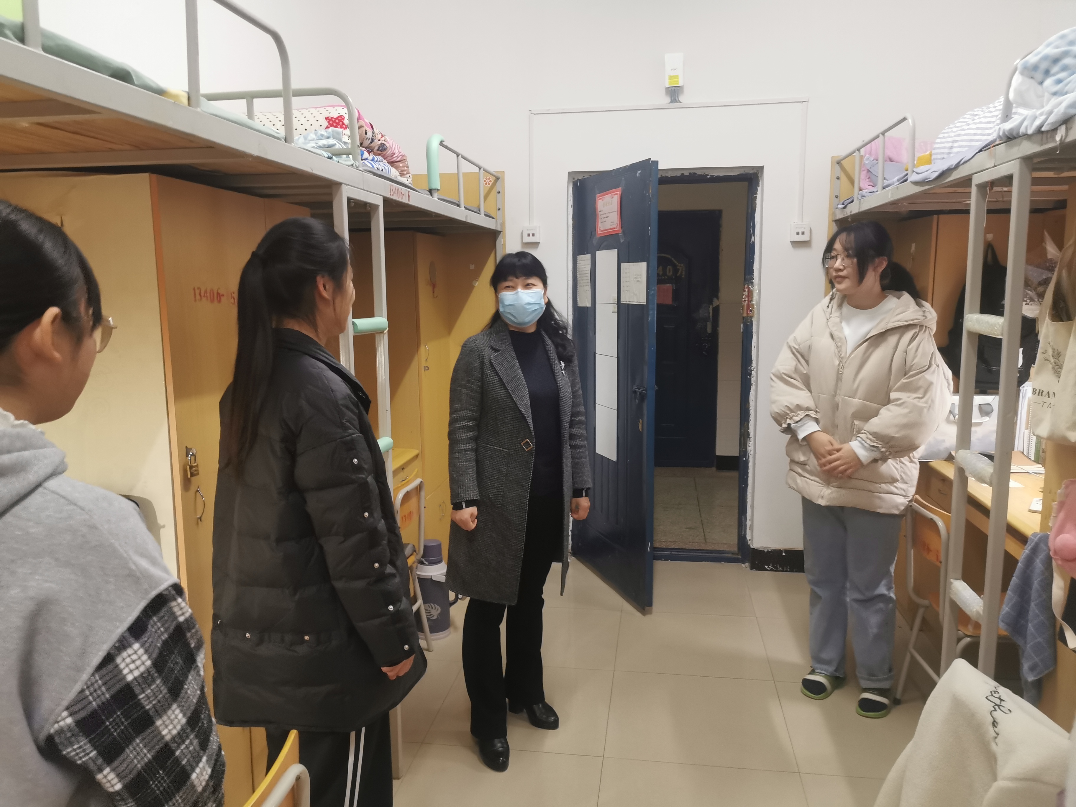 走访过程中,院长蒋领敏予以学生关爱与关怀,她强调,现在处于疫情防控的特殊时期,希望同学们能严格遵循国家及学校的疫情防控要求及请假制度,坚持非必要不外出原则,积极配合学校做好疫情防护工作。她表示,希望同学们能对疫情始终保持高度重视的思想,做好个人防护工作,日常出行佩戴口罩、勤消毒、勤洗手,养成良好的防护习惯。老师们也与学生亲切交谈,深入了解学生的学习和生活情况,尤其是日常生活中遇到的困难和困惑,并鼓励同学们合理安排时间,掌握不同学科的学习技巧,努力攀登学术高峰,提醒同学们要注意用水、用电安全,不使用违规电器,不随意乱拉电线,努力做到减少安全隐患、避免安全事故的发生。党委副书记田占范在走访宿舍过程中,鼓励同学们要保持良好的作息习惯和积极向上的宿舍氛围,建立和谐、文明、安全、卫生的宿舍文化环境。同学们也表示,老师们的关心与帮助让人深感温暖,自己在今后的学习生活中会更加认真、严谨,配合学校做好疫情防控和宿舍安全工作。