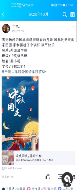 由于疫情的原因,此次活动在线上举行,采取线上发说说的形式进行。同学们都积极参与,说出对祖国的祝福。本次活动使同学们感受到中秋节和国庆节的节日内涵,丰富了同学们的校园生活;激发了同学们的爱国热情,加强了爱国主义教育;同时引导同学们继承和弘扬爱国主义传统,使同学们正确认识肩负的责任和担当。
