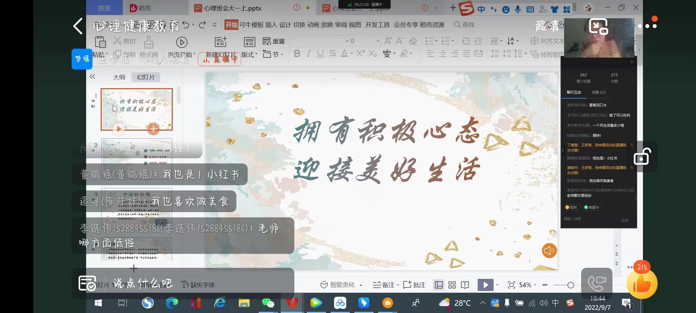 为了帮助新生尽快适应大学生活,疏解成长压力,提高新生的心理素质,9月7日下午,太阳集团tyc151cc面向2022级新生开展了以“拥有积极心态,迎接美好生活”为主题的心理健康教育讲座。本次讲座由太阳集团tyc151cc辅导员王梦瑶主讲,太阳集团tyc151cc全体2022级学生参加。
