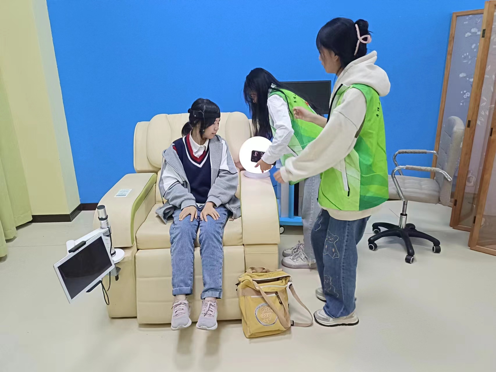 参观伊始,苏安妮向同学们详细介绍了心理健康教育咨询中心的基本情况和预约流程,并对各功能室与心理设备做了详细的介绍与说明,让同学们更全面地了解了心理健康咨询中心的基本情况,为后续心理健康工作的开展奠定了基础。接着,同学们在工作人员的指导下,体验了沙盘、放松椅和减压假人等设备和游戏,在放松心情的同时也更加明确了心理健康咨询中心的各种设施的作用和使用方法。最后,工作人员通过现场知识问答的方式,让同学们对心理健康有了更深入地了解,增强了同学们的心理求助意识,并活跃了现场的气氛,让同学们更好地参与到此次参观中。参观结束后,同学们纷纷表示,自己在今后遇到心理问题时会科学对待并主动求助,以积极健康的心态面对大学生活中的考验。