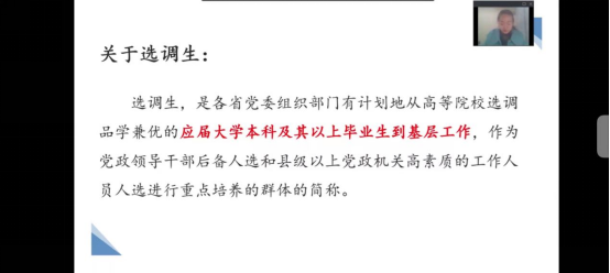 会议伊始,王老师主要从招教、选调生、三支一扶、特岗、公务员考试、就业信息几个方面展开叙述。她向同学们详细地介绍了招教考试的科目、主要内容、选调生的选调条件、数量、对象;三支一扶和特岗招聘的报考条件及公务员考试的选拔条件、考试内容等各类信息。接着,王老师向同学们展示了2020年度各月就业信息发布量数据图,并总结了“金九银十,金三银四”的规律。她指出,当前市场竞争激烈,毕业生所面临的就业形势严峻,希望同学们能放开思路、打开就业面,跟上市场招聘的规律,积极参与校园宣讲会等各类活动。随后,王老师指出,面对就业,同学要懂得提高认识、遵循规律,学会沉着应对、善于分析,明白时不待我、主动出击。她表示,准备就业是“长线作战”,希望同学们能做好时间管理,准备好求职装备,调整好求职心态,有意识地规划自己未来的职业生涯,同时也要放松心态、积极行动。最后,同学们也就自己的职业规划提出了自己的疑问,王老师也耐心地为同学们一一解答。