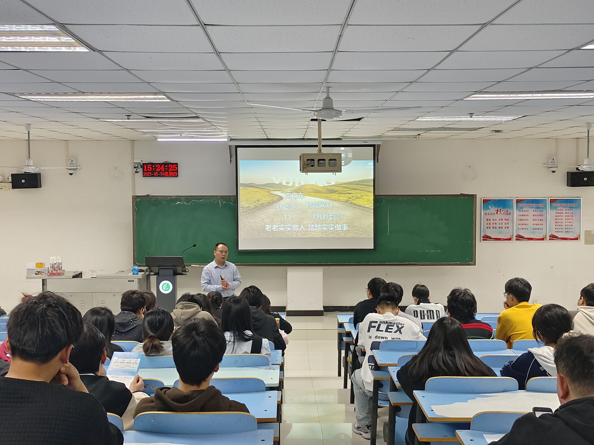 会议伊始,张静向同学们介绍了公司的业务范围、发展概况及公司规模。他讲道,宇通客车是集客车产品研发、制造与销售为一体,产品主要服务于公交、客运、旅游、团体、校车及专用出行等细分市场。企业文化氛围浓厚,强调团队制胜,弘扬创新精神,笃行人性化的管理,包容探索中的失误。能够帮助新人发挥自身才能,快速融入公司环境。接着,他介绍了公司目前需要的是西语方向营销类的管培生及海外销售岗,以及岗位要求。之后,他也针对学生提出的个人发展、薪资待遇、公司福利等问题作出了详细解答。会议最后,张静表示,希望同学们可以认真考虑,积极投递简历,勇于尝试。