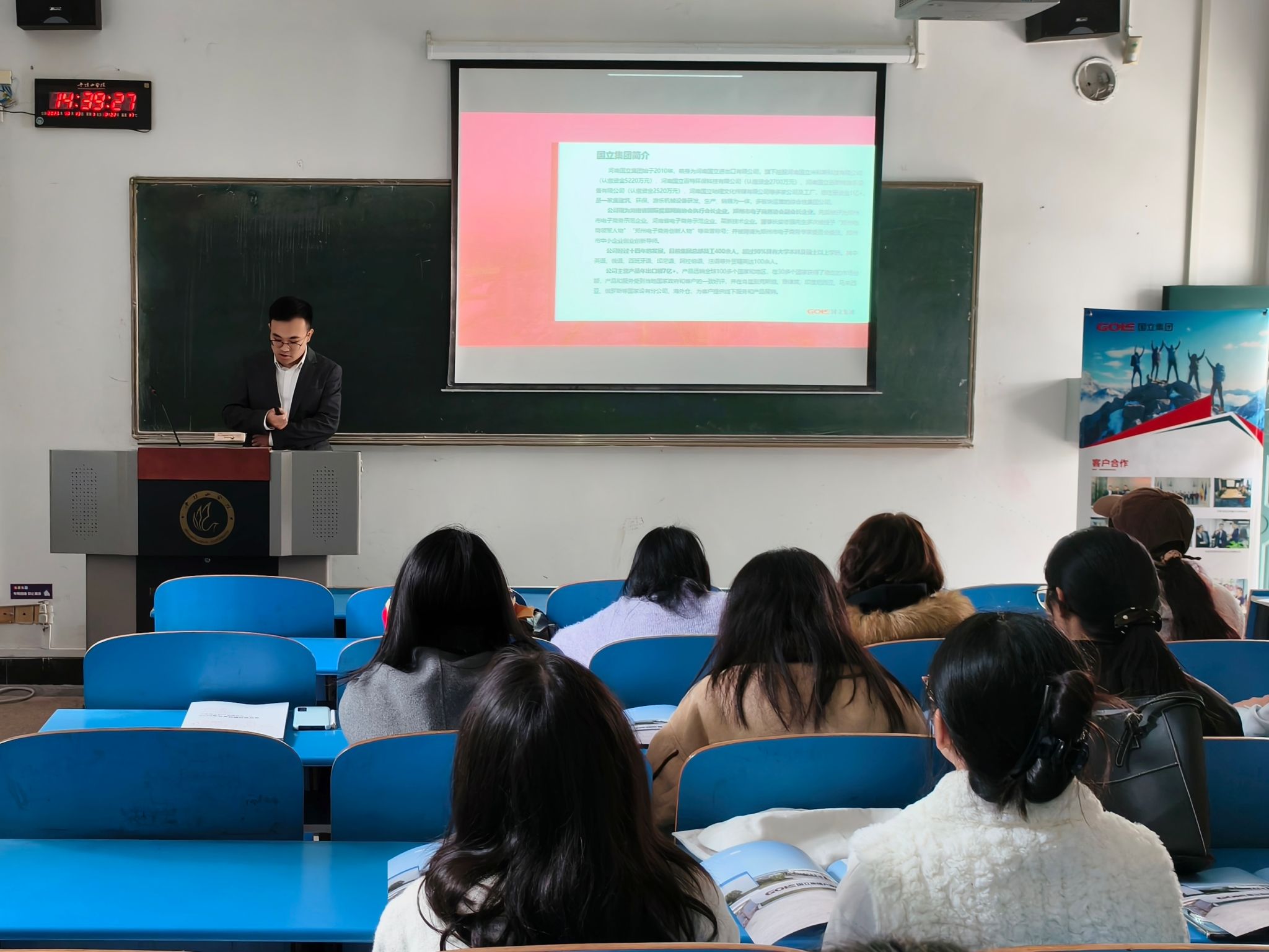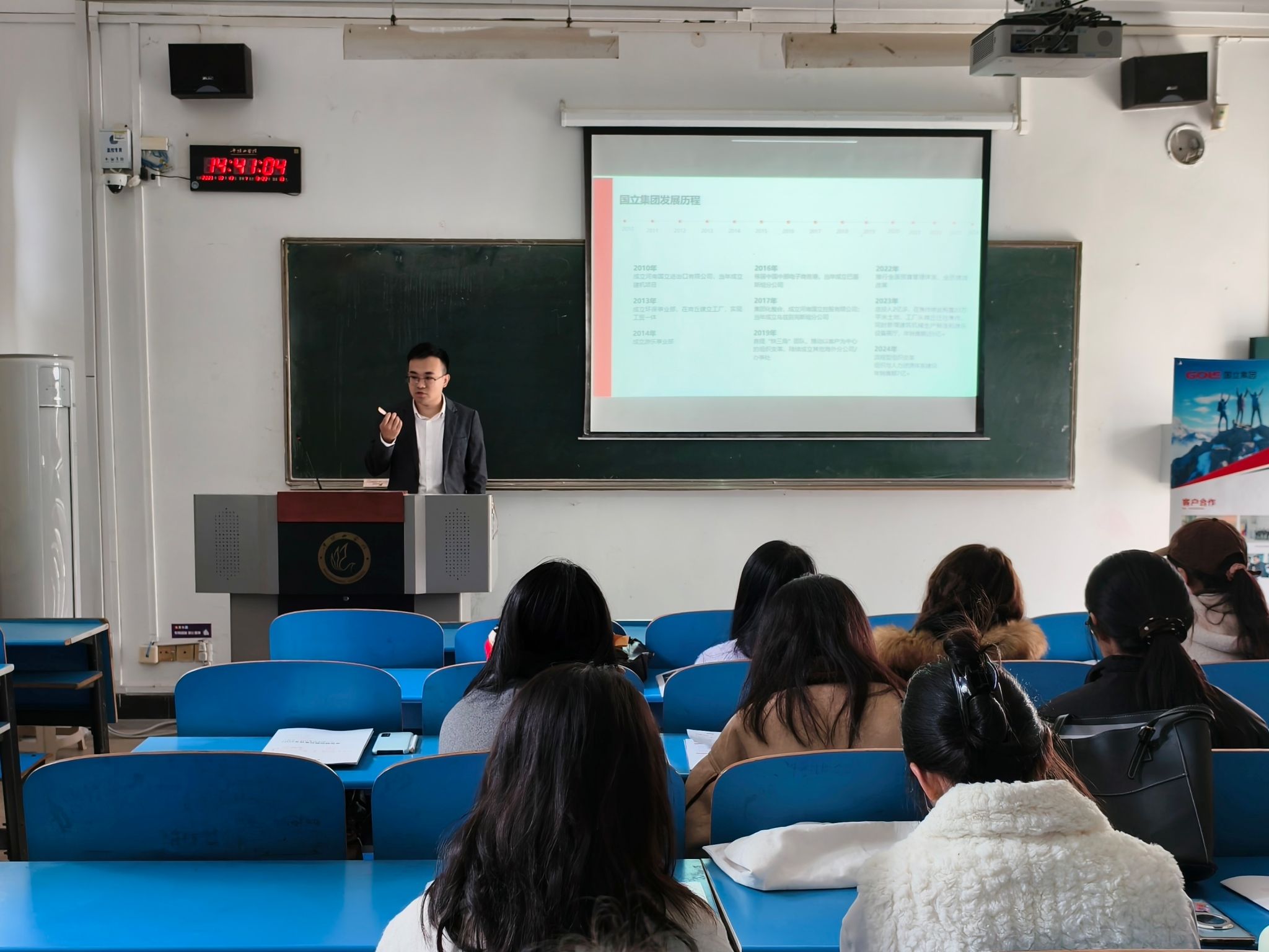 首先,崔璨向同学们详细介绍了公司的基本情况。他表示,河南国立科技集团有限公司自2010年创立以来,已经发展成为了涵盖建筑设备、起重设备、环保设备和游乐设备等领域的综合性企业,旗下拥有多个子公司,在全国多地及海外设有分支机构,业务遍及100多个国家和地区,发展前景广阔。随后,崔璨从公司的产业布局、招聘岗位、人才培养体系及福利待遇等方面展开,对公司进行了全面介绍。在招聘岗位方面,他提到,因公司海外业务拓展需求,现急需西语、英语等语种的外贸业务员,希望同学们结合自身专业和职业规划,积极投递简历。最后,崔璨耐心解答了同学们关于岗位发展、培训机制等方面的疑问,帮助同学们进一步明晰岗位要求。同学们积极与企业互动,现场投递简历,求职氛围热烈。