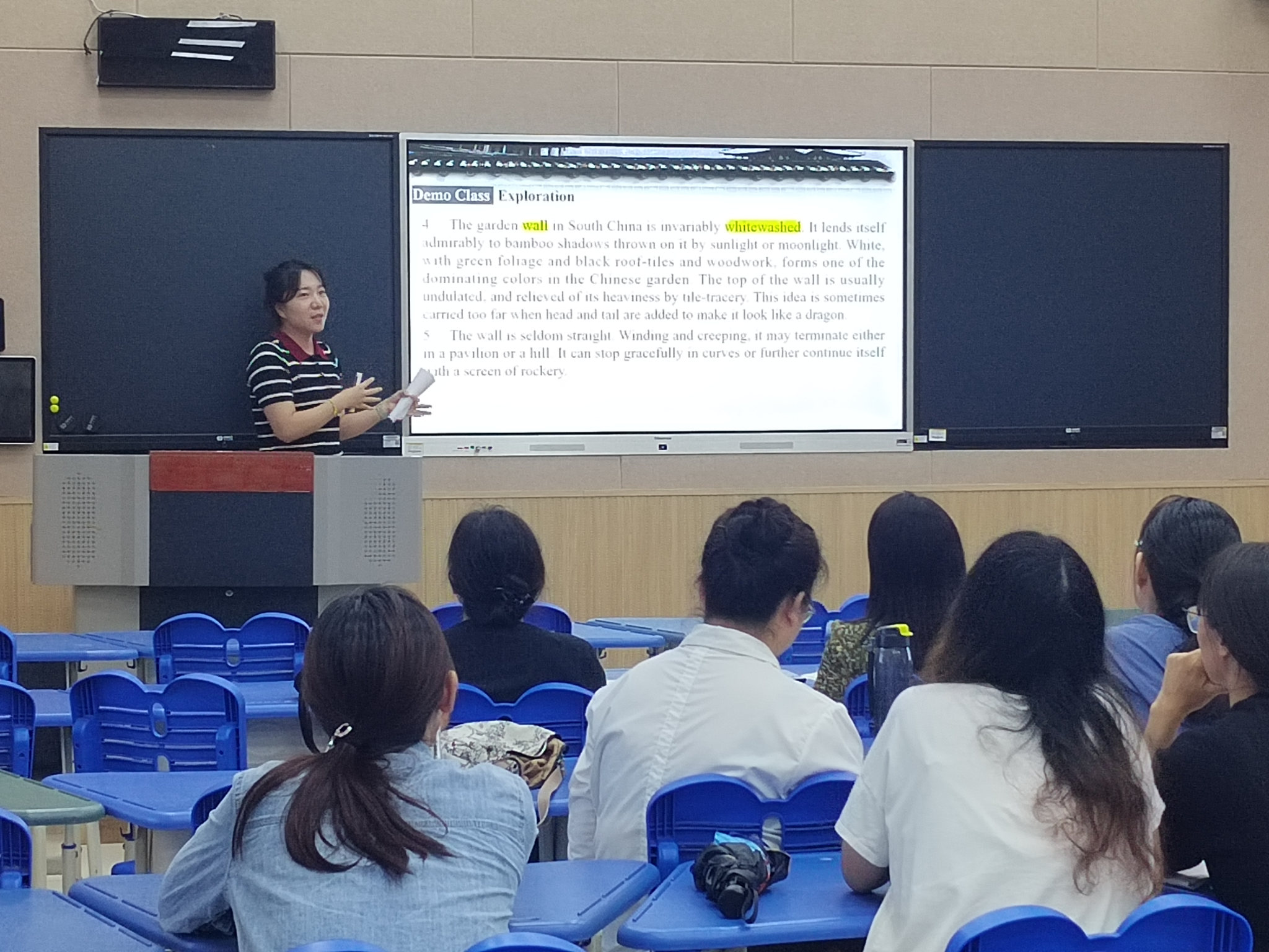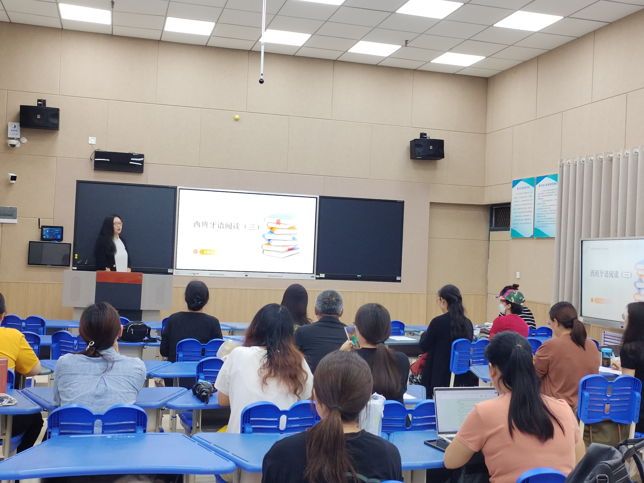 示范引领 共谋良策——在完成诊断评估阶段后,太阳集团tyc151cc英语、商务英语、翻译、西班牙语教研室随即进入了示范研讨与持续改进阶段。9月19日下午,各专业教研室全体教师齐聚L202教室,进行了示范教学和联合教研活动。一批经验丰富的优秀教师以外语类典型课型为切入点,进行了示范教学,展示了对教学高阶性、创新性和挑战度的理解,并提出了对当前教学问题的深刻思考。