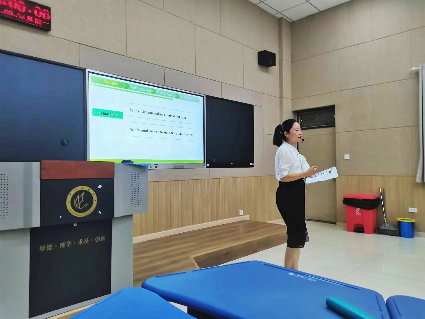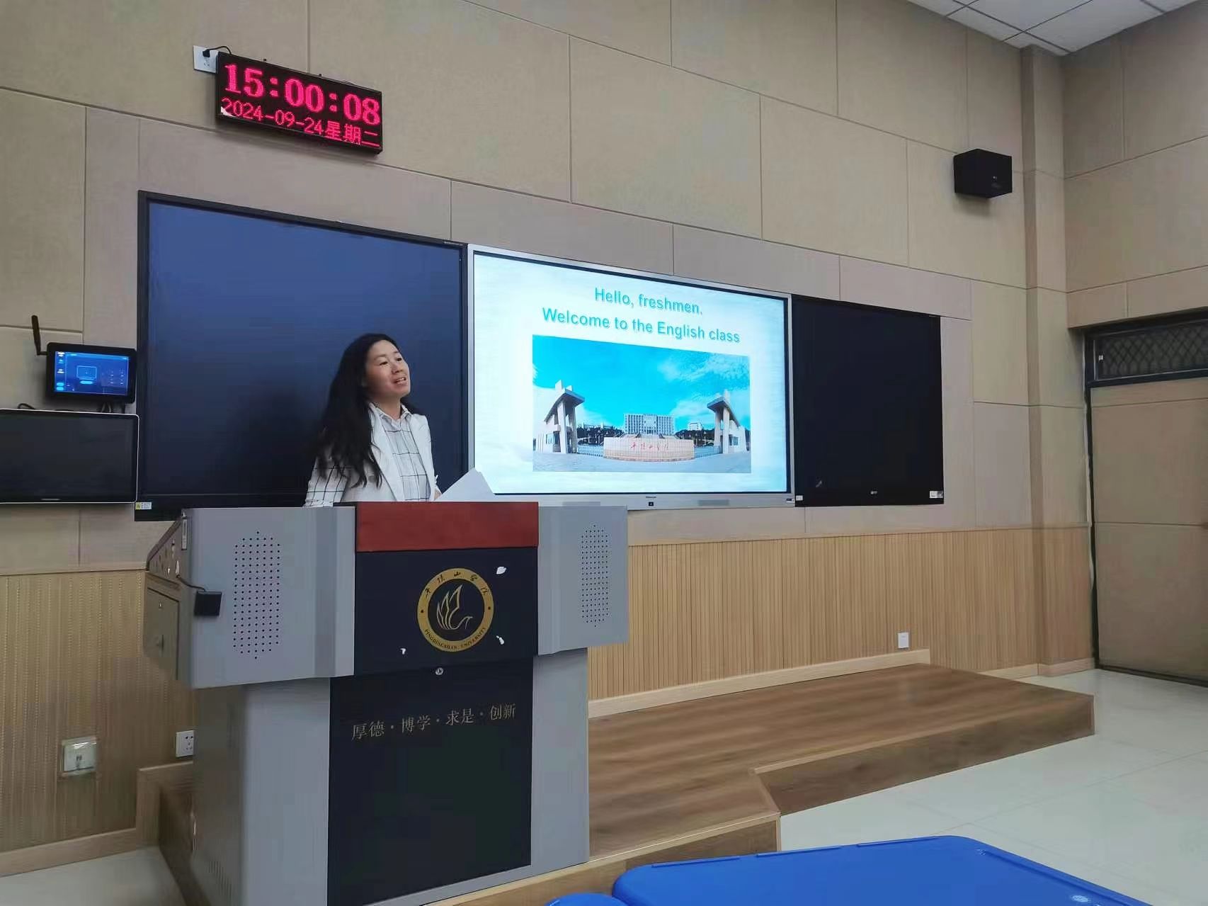 本次公开示范课共有四位主讲教师,分别是普本B组的薛菲菲老师、赵冬勤老师、普本A组的周玲老师、专升本组的李柯老师。每位教师都精心准备了授课内容,并在活动中展示了各自独特的教学方法和风格,获得观摩教师的广泛好评。薛菲菲老师以丰富的教学经验以及生动的听说案例,从教学要求、讲练结合等方面进行了生动的演示和讲解。赵冬勤老师以其严谨的教学态度和清晰的逻辑思路,展现了大学英语教学的规范性和科学性。而李柯老师则针对专升本学生的特点,展示如何采用灵活多样的教学手段,激发了学生们的学习兴趣。周玲老师则通过写作课案例分析和实践操作,展示了逻辑严密、深入浅出、特色突出、互动高效的课程教学过程。每节示范课结束后均设有互动环节,四位主讲教师就各自群组的授课内容、教学方法、课堂管理等方面与大家进行分享和交流,与会教师也积极参与讨论,就课堂内容、教学策略及班级管理等多个方面提出了宝贵的意见和建议。最后,蒋领敏院长对本次公开示范课进行了点评和总结。她充分肯定了活动取得的成效,并指出了其中的亮点与不足。同时,她还鼓励教师们继续探索创新,不断提升自身的教学能力和水平,为学院大学英语教学质量的提升贡献自己的力量。
